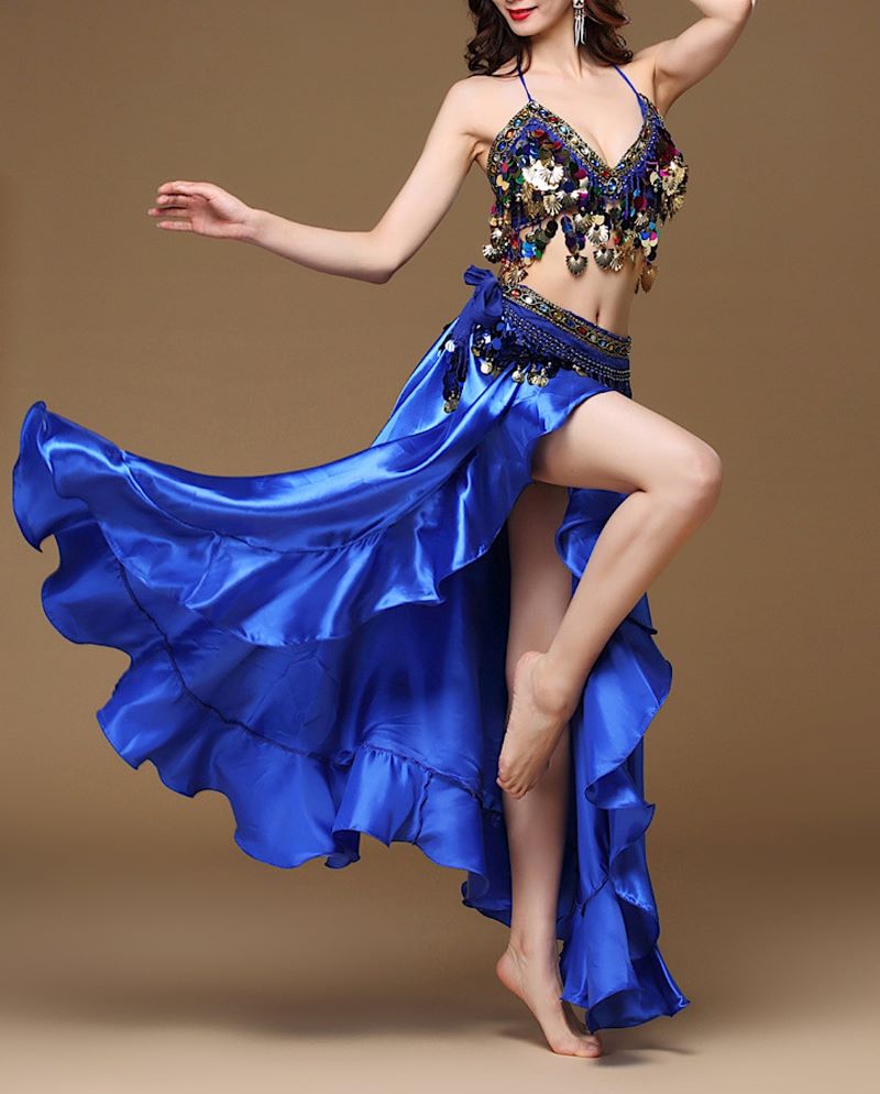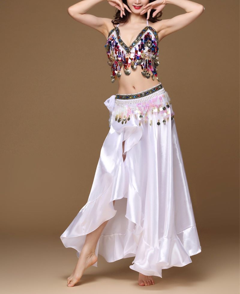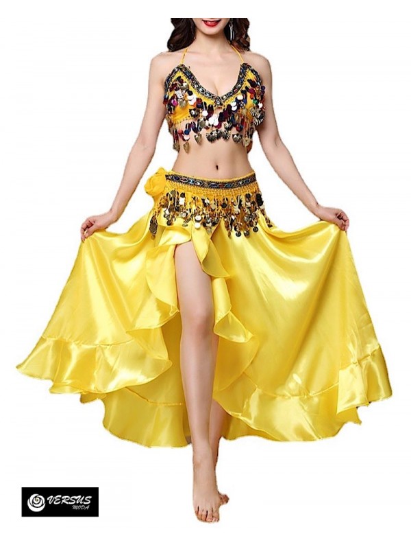 Completo da Ballo Donna, Set Top, Gonna in Raso a Conchiglia con Spacco, Cintura: Odalisca, Danza del Ventre, Saggio, Jasmine