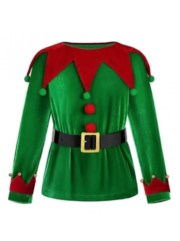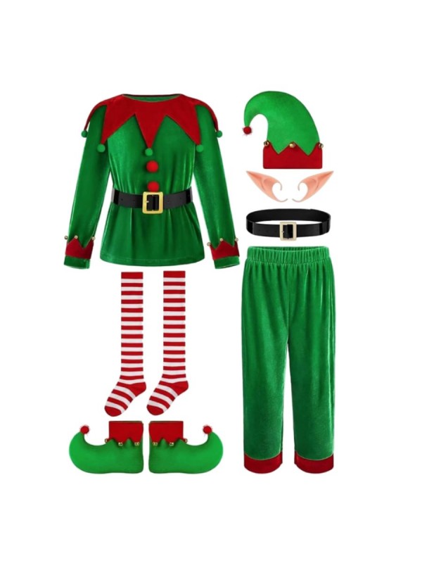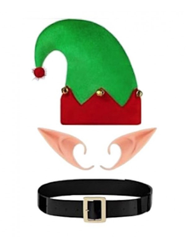 ELF015 - ( Set 7 pezzi - 7 piece set ): Cappello / Hat + Maglia / Top + Cinta / Belt + Pantaloni / Pants / + Calzini / Socks + Copri Scarpe / Shoes Cover + Orecchie da Elfo / Elf Ears