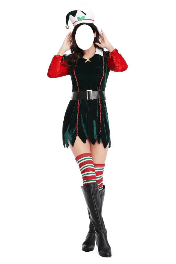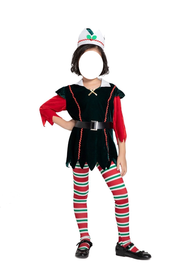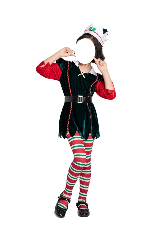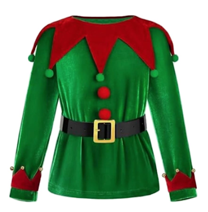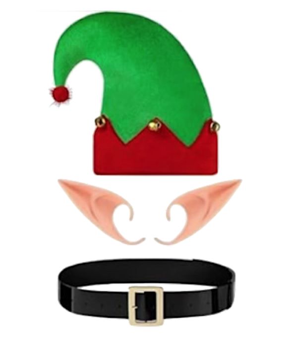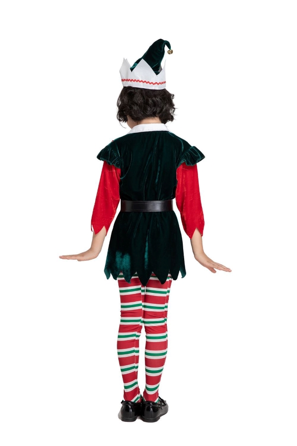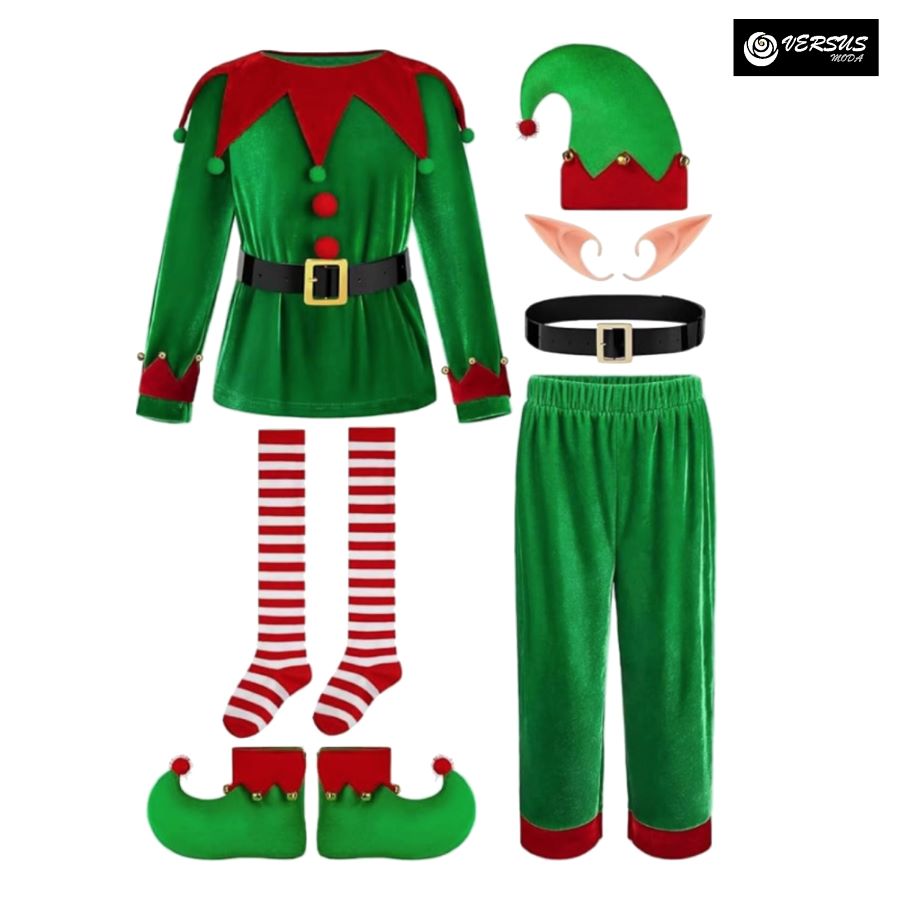 ELF015 - ( Set 7 pezzi - 7 piece set ): Cappello / Hat + Maglia / Top + Cinta / Belt + Pantaloni / Pants / + Calzini / Socks + Copri Scarpe / Shoes Cover + Orecchie da Elfo / Elf Ears