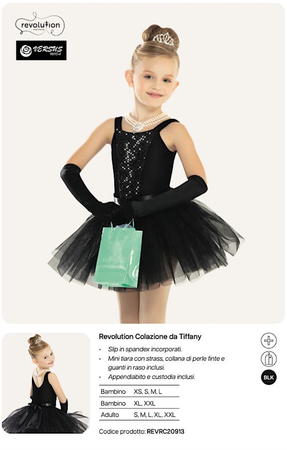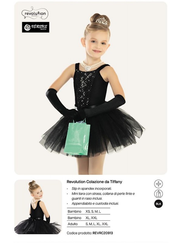 - Include collana, guanti in raso elasticizzato, mini diadema, borsa, appendiabito e custodia protettiva.