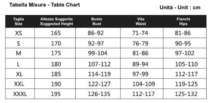 Utilizzare l' immagine della tabella per riferimento alla taglia da ordinare.