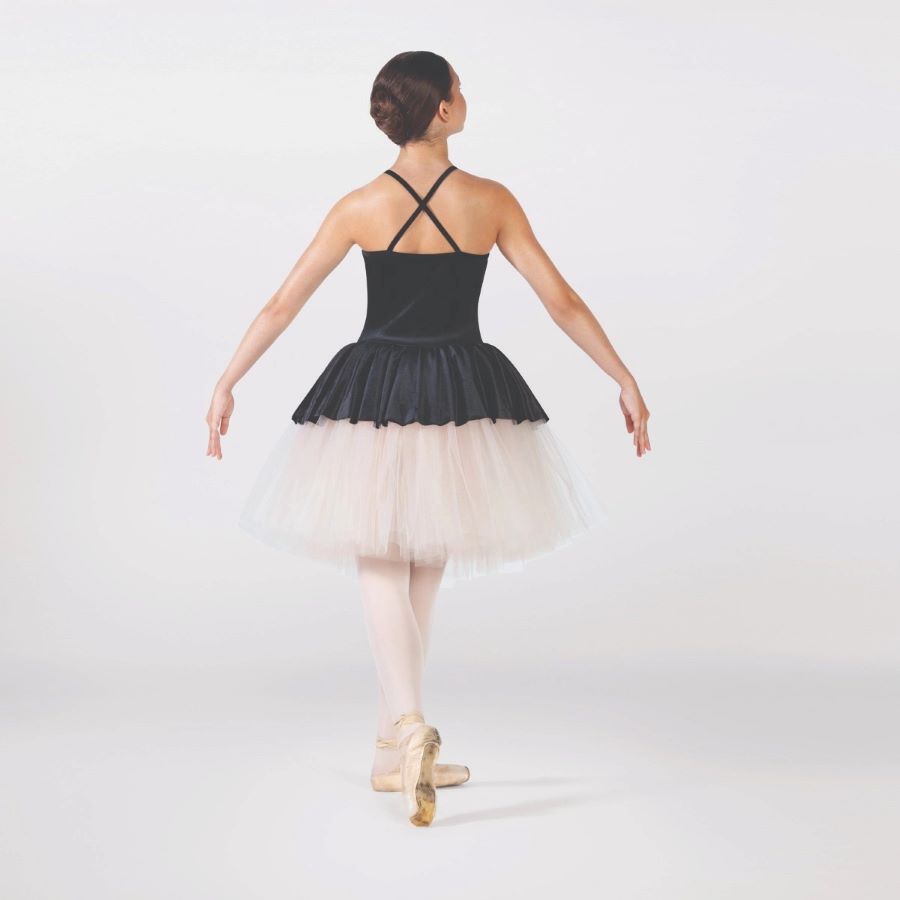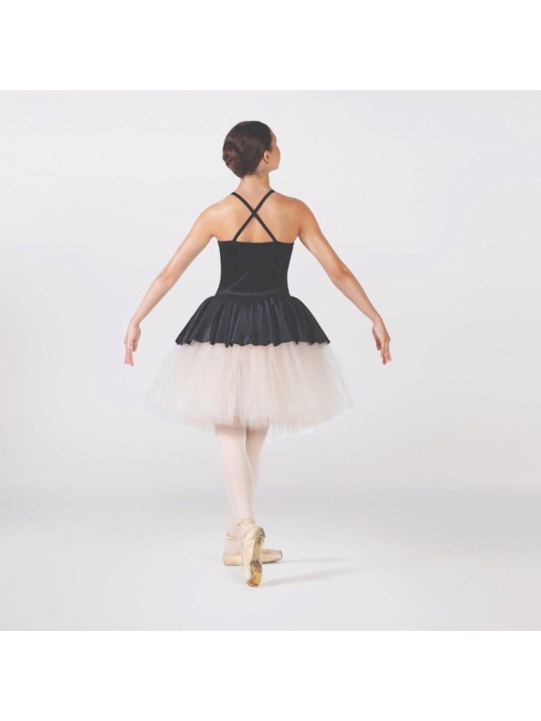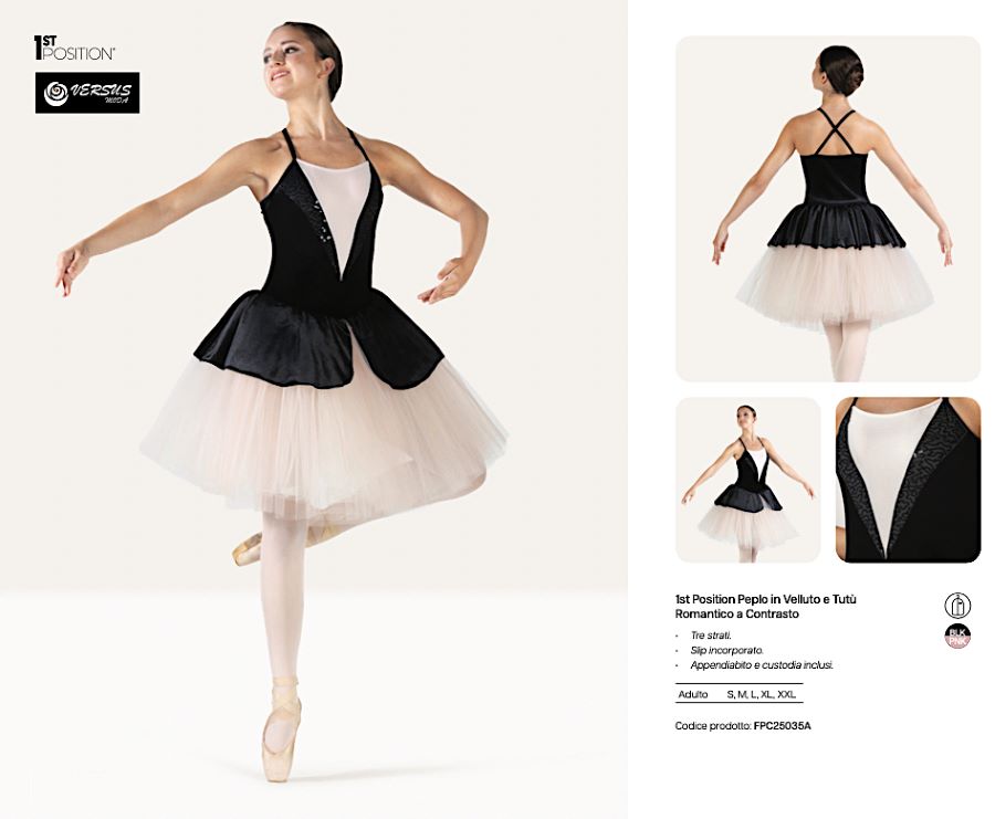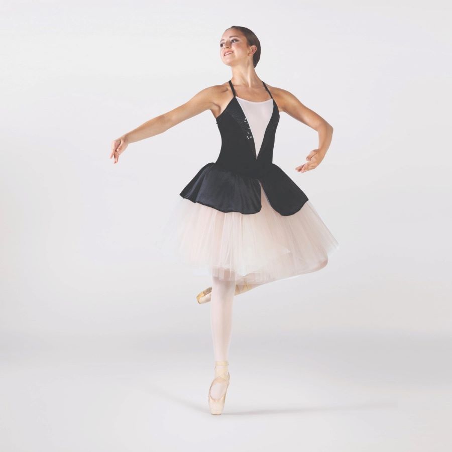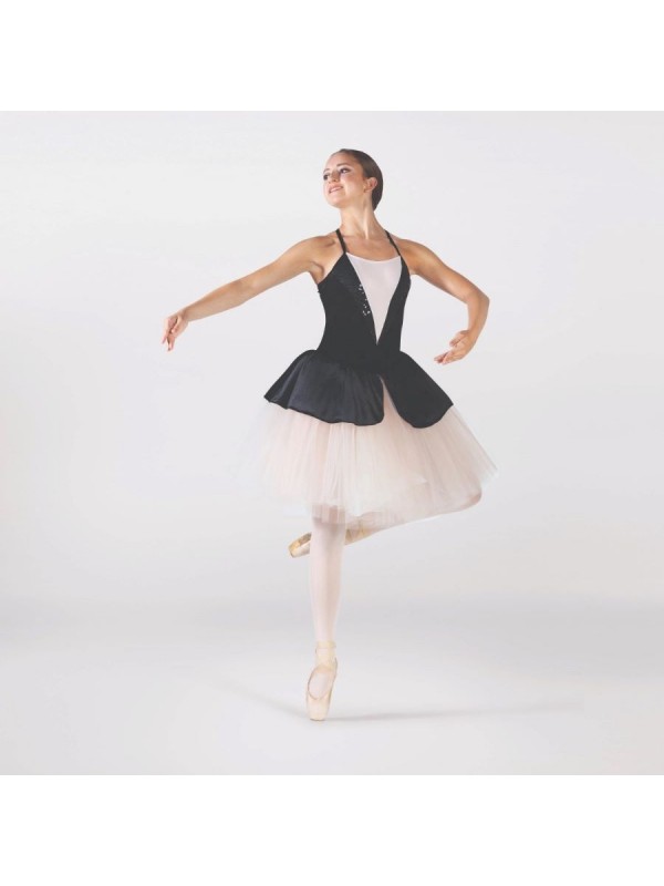 Una versione elegante del classico tutù romantico, questo modello 1st Position presenta un corpetto e un peplo in velluto ed è completato da un risvolto con paillettes per un look da ballerina opulento. Contrasto Nero e Rosa.